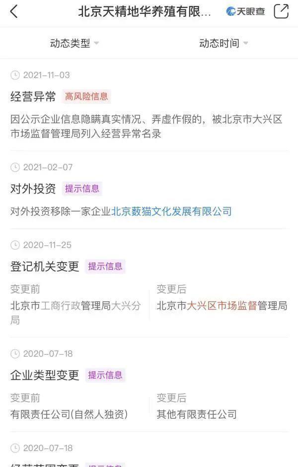 扒公司成了网友的全民运动。有细心网友在企查查一查,光北京就注册了9家公司,上海2家,产业从影视到养殖都有。有一家叫“天精地华宠乐园”的,主打儿童游乐,拿设特兰矮马做卖点。可这家公司早就在经营异常名单里挂着了。