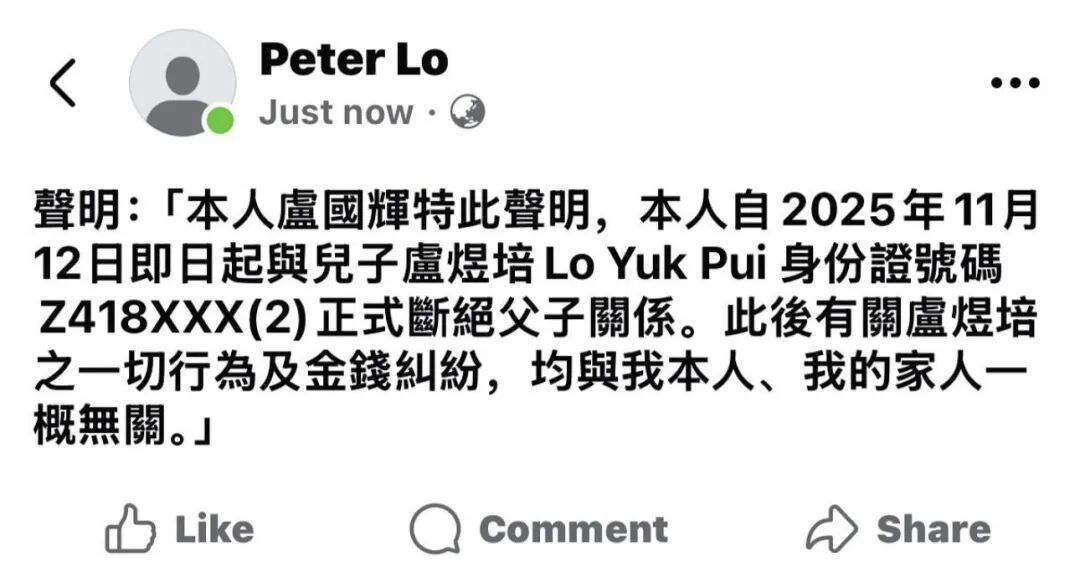 2025年11月12日,岳父卢国辉做出了一个让人惊讶的决定,他发布公开声明宣布与儿子卢煜培断绝父子关系,告知公众其以后的一切行为及金钱纠纷都与家人无关。